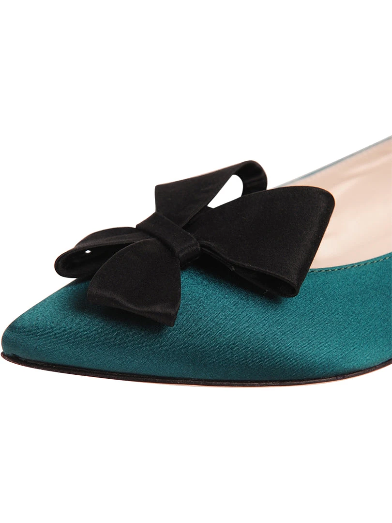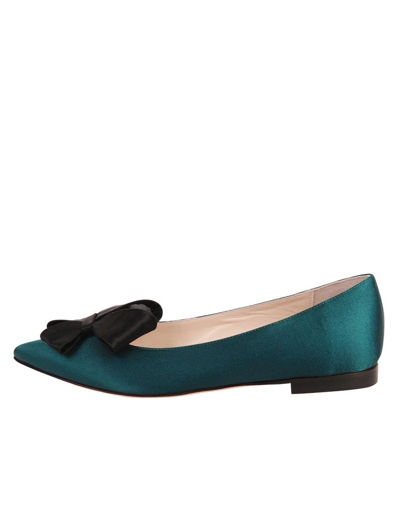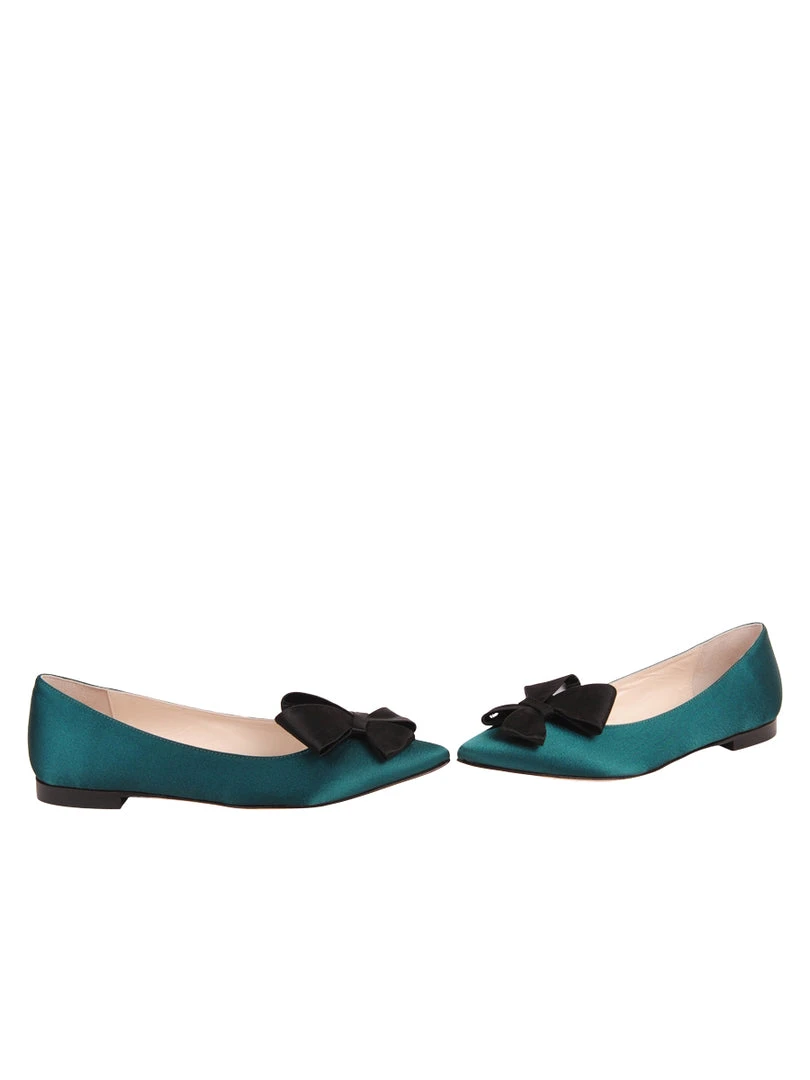 Stunning satin or suede covers these pointed toe flats. A satin Butter Bow makes these versatile and timeless.